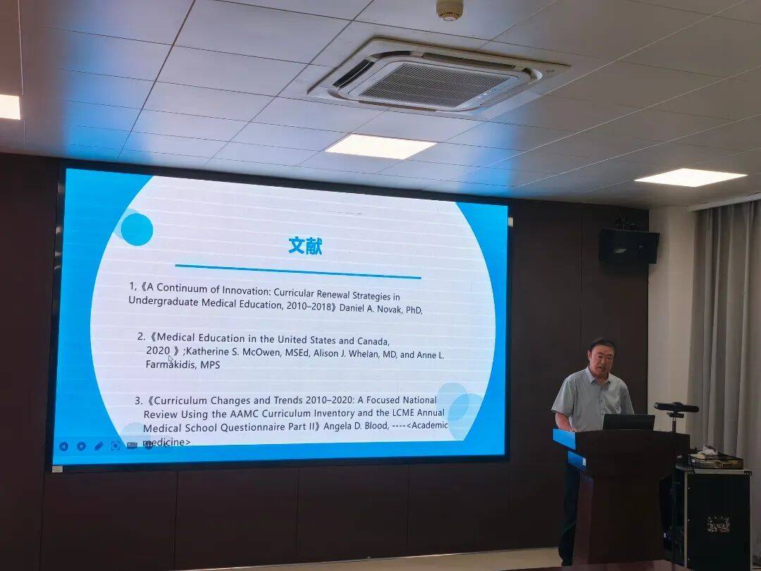 张海东对孙宝志教授的莅临指导表示热烈欢迎和衷心感谢,他指出,此次研讨会对推动临床医学(卓越)专业高质量发展起到重要作用。王丹丹围绕临床医学(卓越)专业的建设情况作专题汇报。她从培养目标、课程体系、整合课程改革、培养过程、培养特色、考核评价等方面进行了全面阐述。
