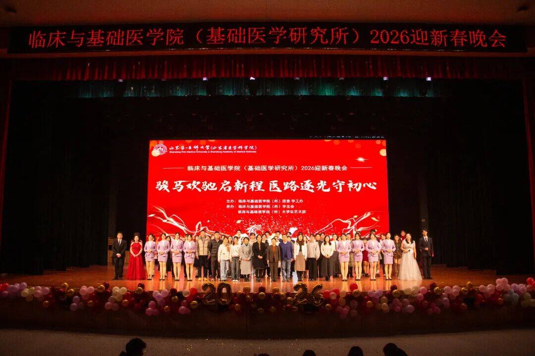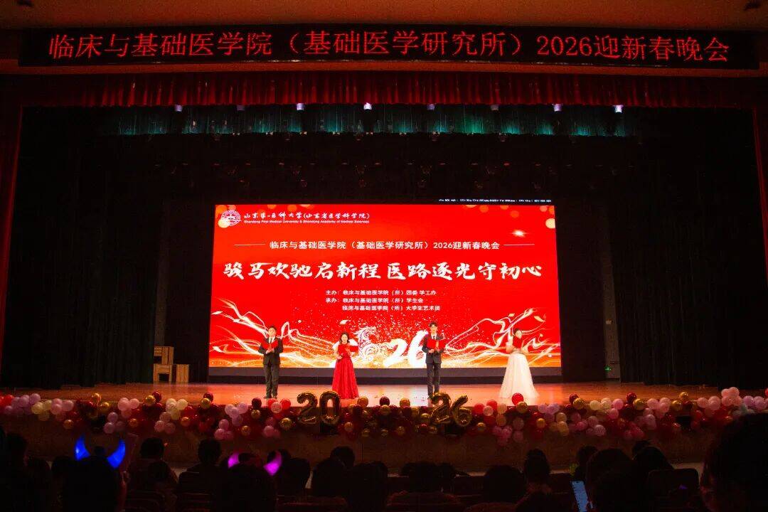 骏马欢驰启新程,医路逐光守初心。12月24日,临床与基础医学院(基础医学研究所)2026年迎新春晚会在济南校区大学生活动中心举行。山东第一医科大学党委委员、副校长(副院长)成敏,副校长(副院长)、第三附属医院(省医学科学院附属医院)院长辛涛,院(所)党委书记仲浩,党委副书记岳芸出席活动并参加师生互动环节。院(所)师生欢聚一堂,共迎新春。