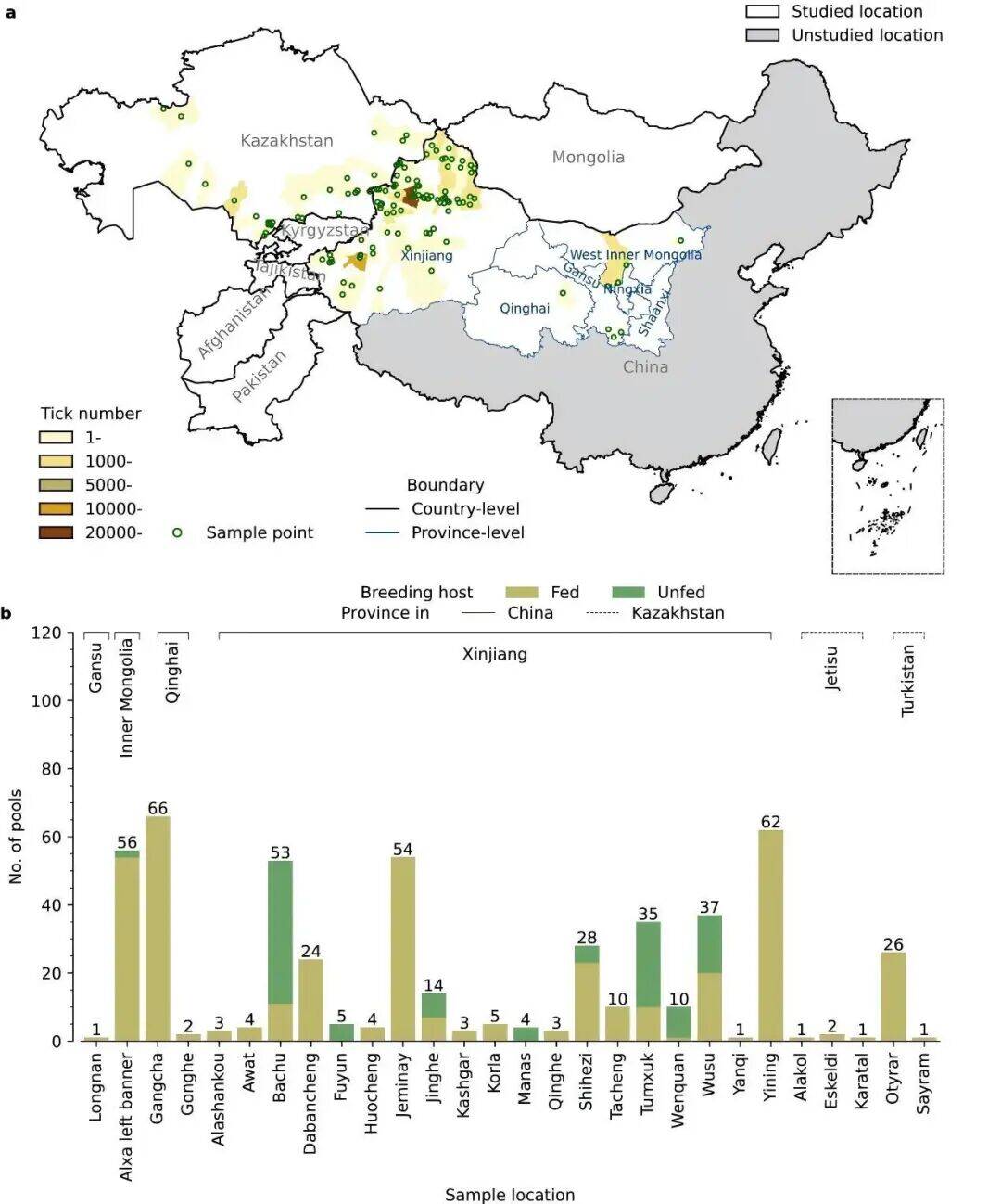 该研究系统采集了中国西北地区和哈萨克斯坦的蜱虫,揭示了该地区的蜱虫物种和TBVs的高度多样性,并进一步预测了重要感染性蜱传病毒及其媒介蜱虫的地理分布,全面描绘了该地区人畜共患TBVs的疾病风险和潜在受影响的人群,为这一广阔地区乃至全球蜱传病毒性疾病的预防和控制提供了宝贵的资源。