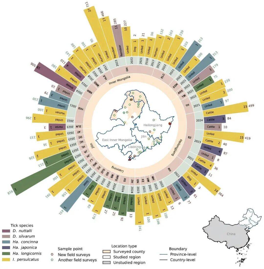 该研究在东北亚地区开展了大规模、多来源数据的蜱传病毒系统性调查与风险建模,揭示该区域为多种高致病性蜱传病毒的高风险区,其潜在影响人口规模巨大、地理范围广泛;亟需对该地区蜱传病毒加强监测、预警与防控体系建设,特别是针对农民、边境地区及跨境传播风险。该研究为区域公共卫生决策提供了科学依据,也对全球新发传染病的防控具有重要参考价值。