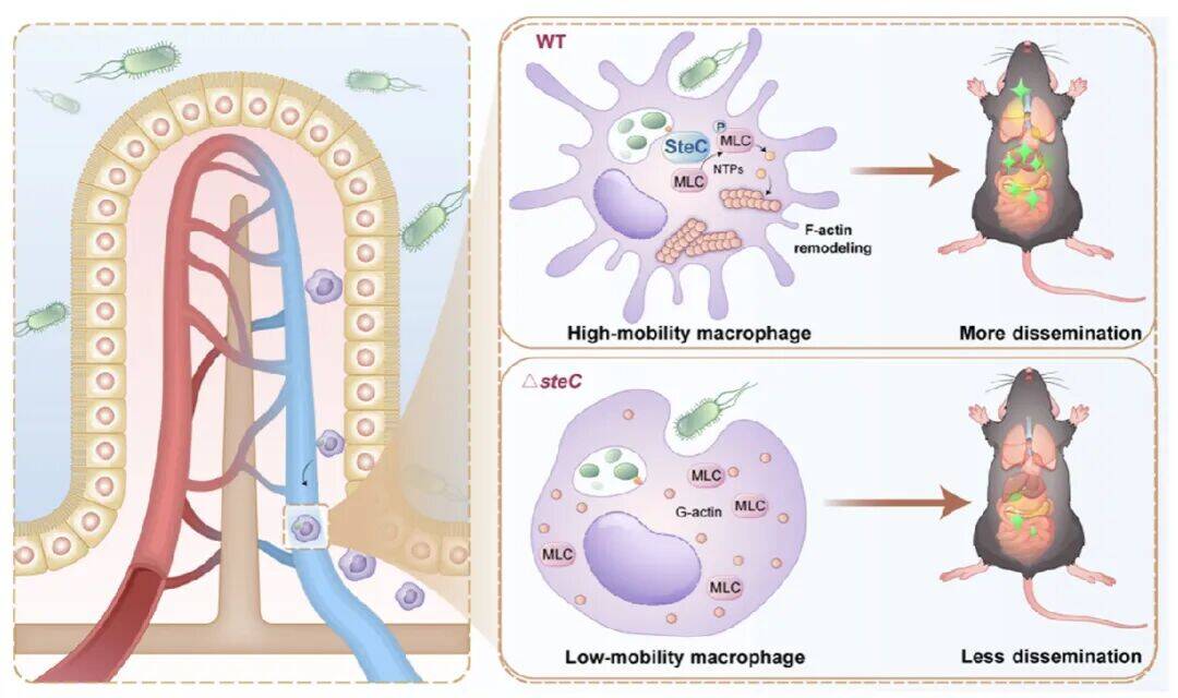 此外,研究团队成功解析了SteC蛋白的晶体结构,首次阐明其依赖非典型二聚体构象发挥催化功能的分子机理。功能实验进一步证实,SteC介导的细胞骨架重编程对沙门氏菌突破肠‑血管屏障、进而向全身靶器官扩散具有不可或缺的作用。