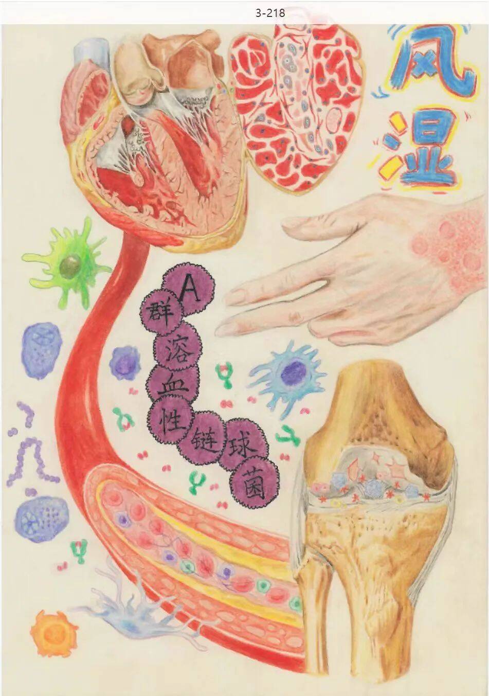 本作品为原创作品,聚焦于心血管疾病中风湿病的基本病理变化。本作品以海报视觉化叙事构建疾病全景:左上结合大体病理与组织病理呈现风湿性疣状心内膜炎与Aschoff小体。中部阐明风湿病的病因。右下以风湿性关节炎收尾揭示软骨侵蚀。底部以动态血管表现出风湿性动脉炎淋巴细胞浸润的过程,整体配合漫画式的炎细胞维持科普维度,将复杂病理转化为大众可感知的生命艺术。本作品旨在唤起公众对风湿病的关注,增强预防意识。