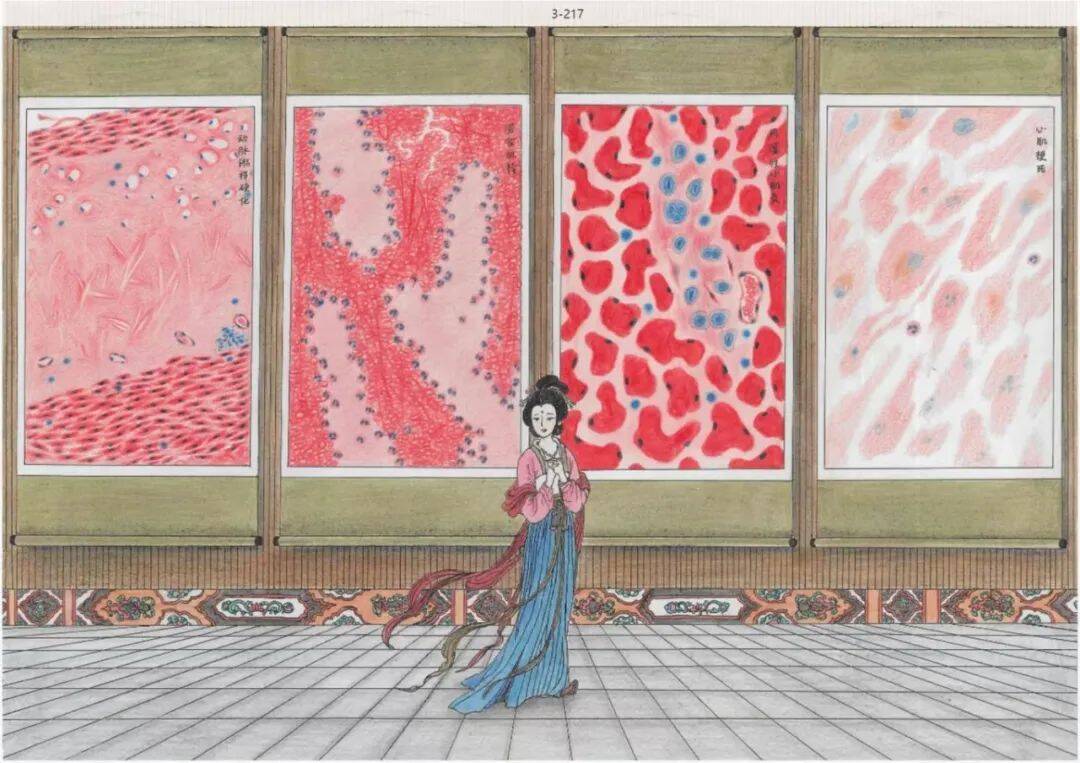 《西子捧心》以古典“西子捧心”意象为灵感,将古典与心血管病理绘图结合。画面中央勾勒西施蹙眉捧心姿态,后面四幅医学形态学画作展现了冠状动脉粥样硬化、混合血栓、风湿性心肌炎、心肌梗死的微观病理结构。西施抚心观画,隐喻古人胸痛表象与现代心血管疾病的内在关联,在古典意境与医学严谨性的碰撞中,呈现历史病症与现代病理研究的跨时空对话。
