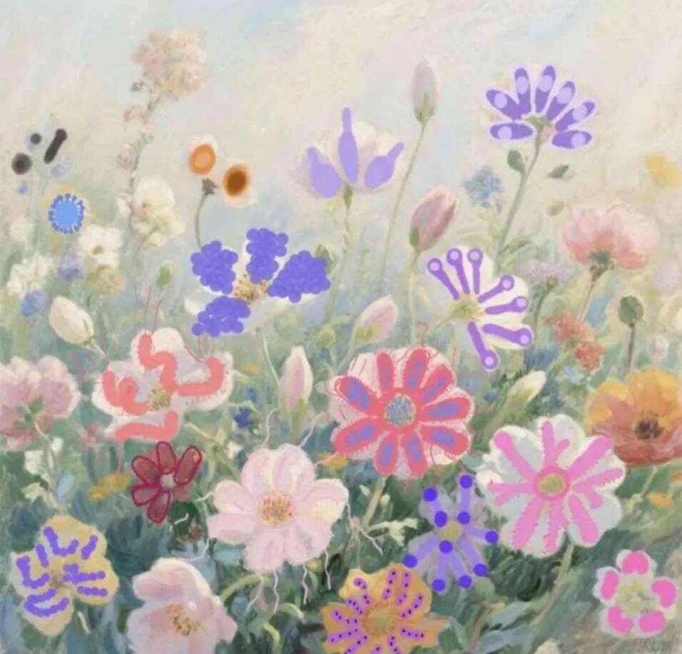 在人体的体表和腔道存在微生态,大部分是正常的菌群,他们对维持皮肤、黏膜以及人体健康起着重要的作用。这幅作品以“远看真花,近看‘菌’花”为巧思,构建出奇妙的视觉体验。远观,画面是一片绚烂花海,色彩缤纷,形态各异的“花朵”生机勃勃,令人仿若置身于自然花园的美好之中。近赏,却惊喜发现每朵“花”皆是菌类的艺术化呈现——各种各样不同细菌绽放成形态各异的花朵,中间的花冠便是细菌的菌落。试图将微观世界的菌类转化为宏观花朵,打破常规认知,既展现了自然不同视角的美感,也巧妙呼吁人们关注微观生物,激发对自然多样性的探索热情,实现了艺术与科学认知的美妙融合。